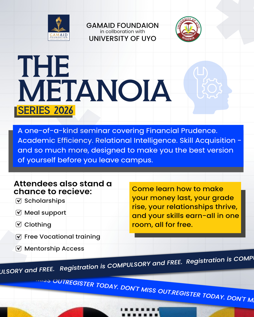 The Metanoia Impact Series is a transformative seminar designed to equip students and young individuals with the knowledge, skills, and mindset needed to thrive both during and after their academic journey. Organized by GAMAID Foundation in collaboration with the University of Uyo, this one-of-a-kind event focuses on building well-rounded individuals prepared for real-life success.